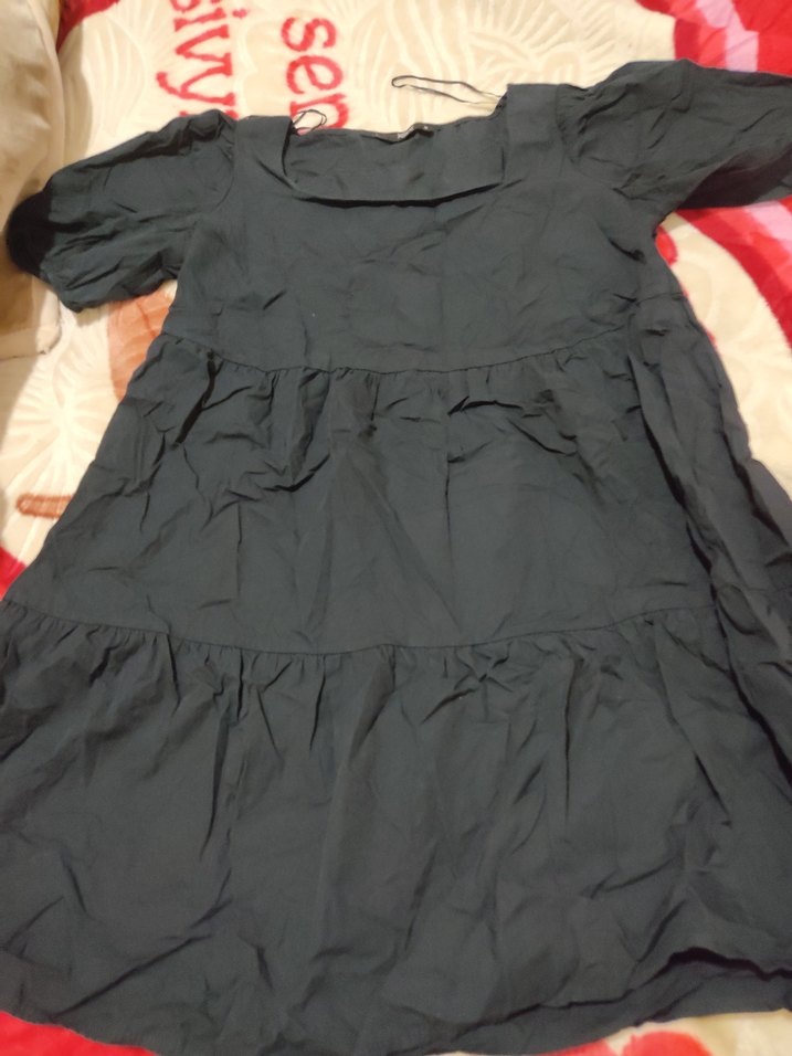 Siyah keten kumaştan, V yaka ve kısa kollu, bol kesim midi elbise. Fırfır detaylarıyla gündelik gotik tarzda şık bir seçenek.