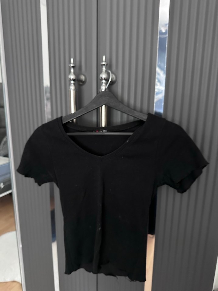 Siyah, v yaka, kısa kollu ve fitted kesim kadın tişörtü. Minimalist goth tarzıyla günlük kullanıma uygun, hafif ve pürüzsüz bir malzemeden üretilmiştir.