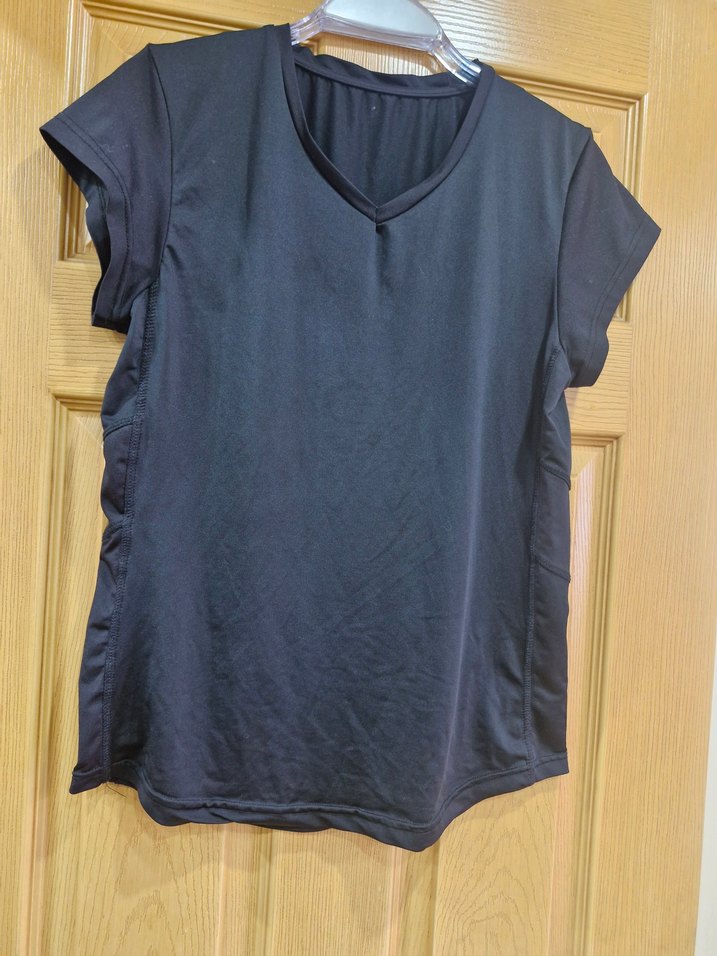 Siyah, V yaka, kısa kollu, bol kesim kadın tişörtü. Pürüzsüz sentetik kumaştan üretilmiş, spor tarzdadır, günlük sokak stili için uygundur. Esnek kumaştır 44 bedendir 2XL