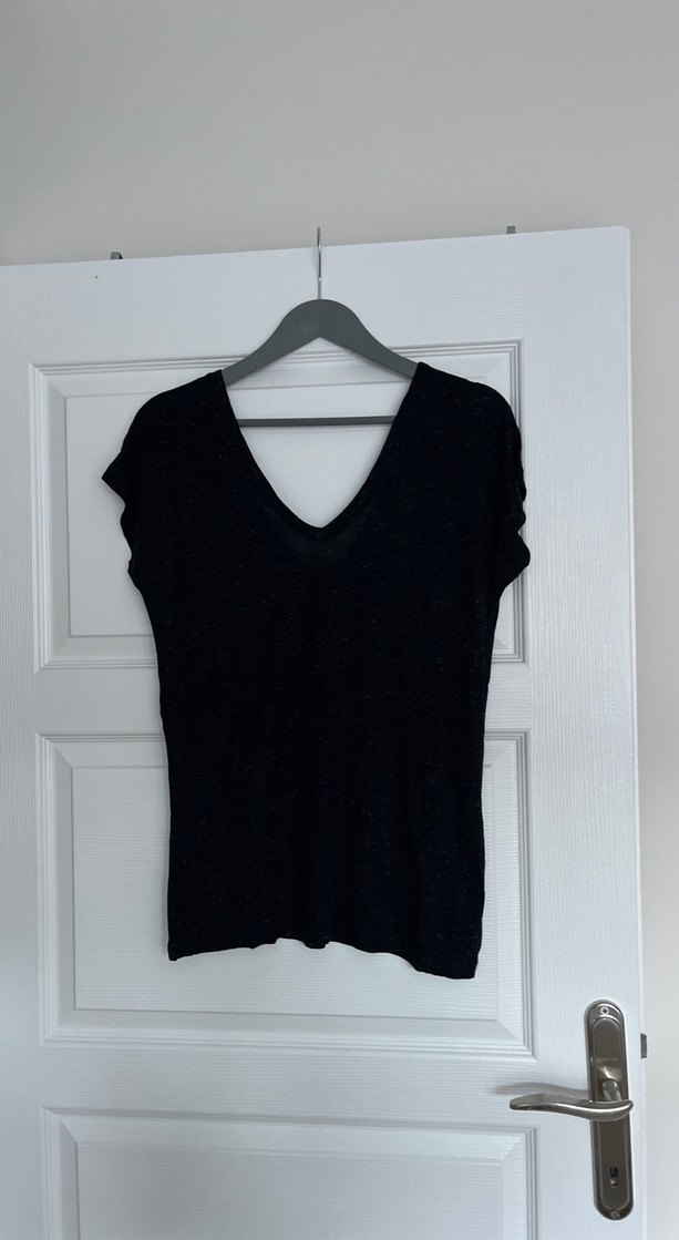 Siyah keten, V yaka ve kısa kollu, salaş kesimli tişört. Minimalist ve gotik tarzda, rahat ve zahmetsiz şıklık sunar.