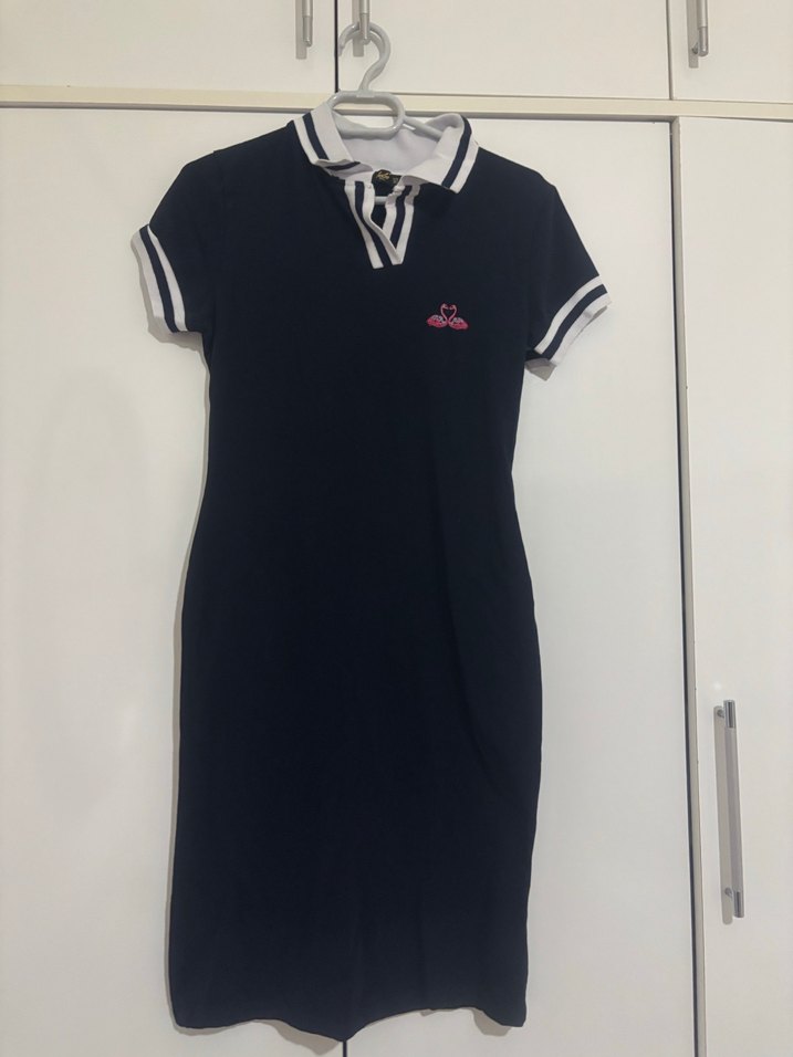 Siyah midi elbise, v yaka ve kısa kollu, vücuda oturan kesime sahiptir. Beyaz çizgili yakası ve kol manşetleri ile küçük pembe nakış detaylıdır. Günlük rahat ve şık bir seçimdir.