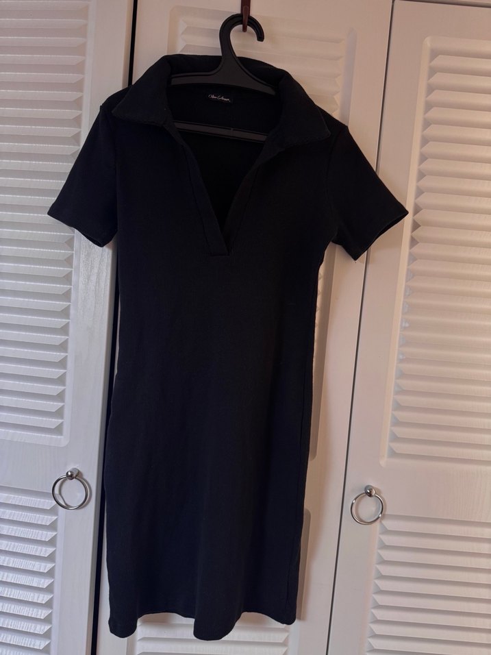 V yaka, kısa kollu, yırtmaçlı siyah midi elbise, günlük kullanım için yumuşak sentetik kumaştan yapılmıştır.