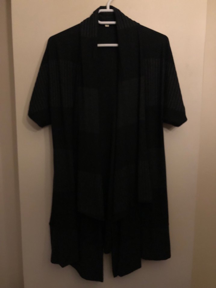 Siyah renkli, kısa kollu, V yakalı ve midi boyda bol kesim, dökümlü bir hırka. Sentetik kumaştan üretilmiş, minimalist gotik tarzda günlük kullanıma uygun.