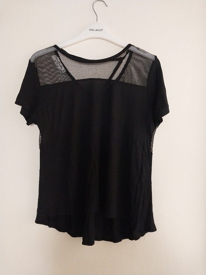 V yakalı, kısa kollu, gevşek kesim siyah bluz. Yakada ve omuzlarda file detayları bulunur. Pürüzsüz sentetik kumaştan, günlük kullanıma uygun.