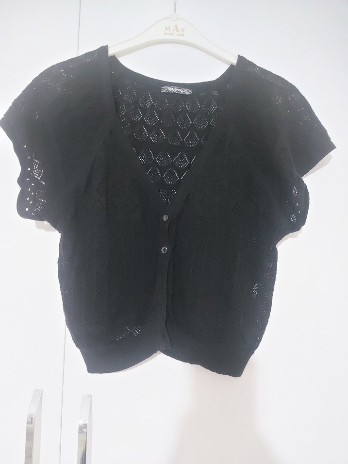 Siyah örgü hırka, V yaka ve kısa kollu, bol kesim ve kısa boyda. Gotik tarzda, desen içermeyen günlük kullanıma uygun.