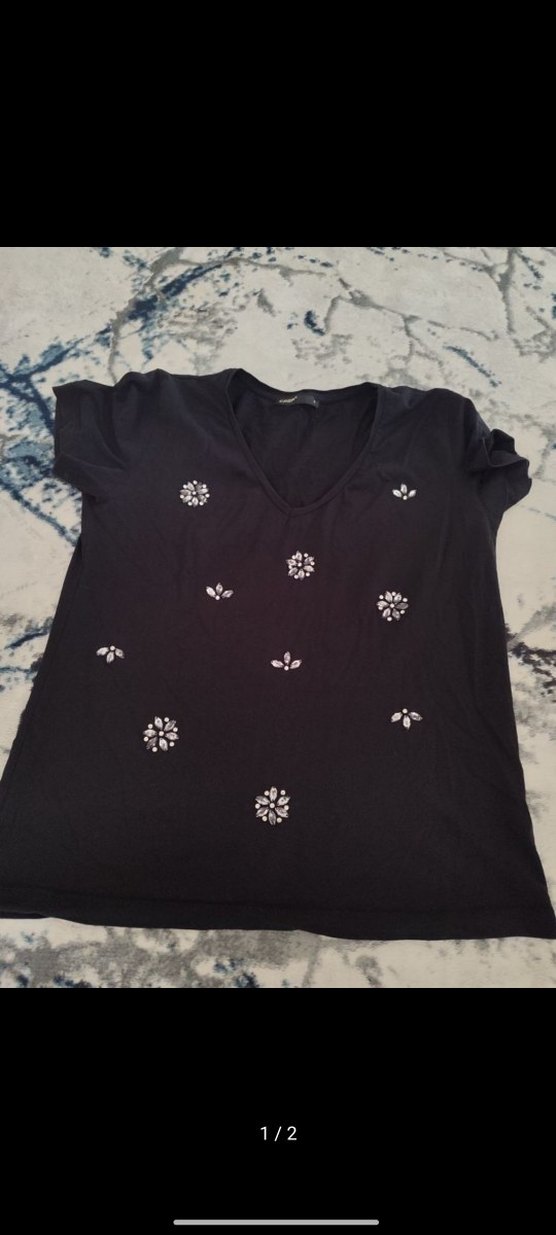 Siyah pamuklu, kısa kollu, V yakalı, payetli çiçek desenli, bol kesim kadın tişörtü.