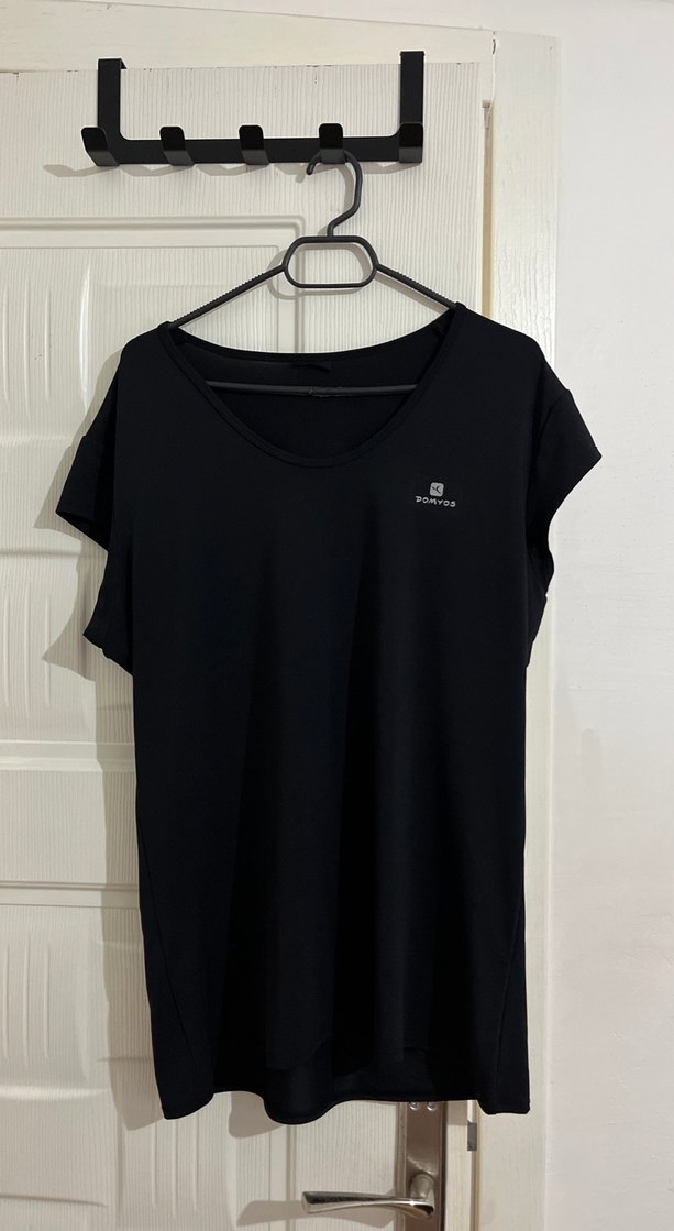 Siyah, V yaka kısa kollu, bol kesim tişört. Küçük baskılı logo detaylı, yumuşak sentetik kumaştan, rahat sokak stili için uygun.