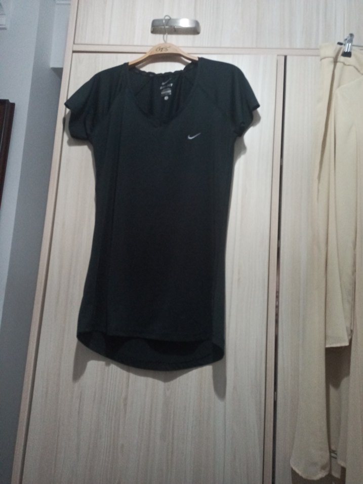 Siyah renkli, V yaka kısa kollu ve vücuda oturan kesime sahip spor tişört, yumuşak sentetik kumaştan üretilmiştir. Şehir stili için uygundur.