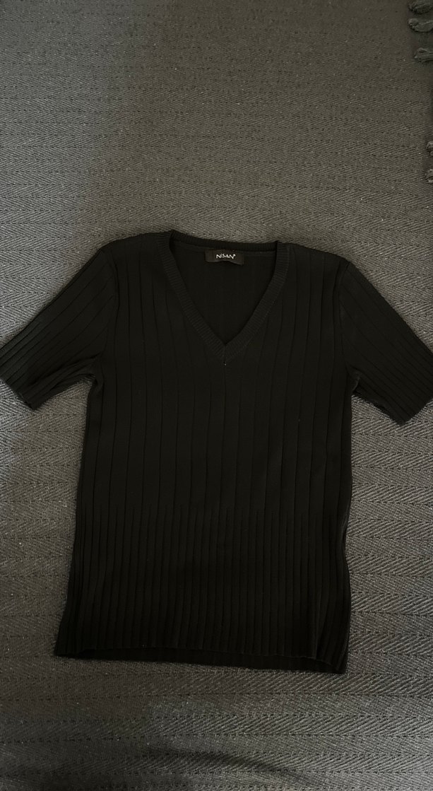 Siyah renkli, kısa kollu, V yaka, triko dokulu ve vücuda oturan kesime sahip günlük kullanıma uygun tişört. S M L bedene olur