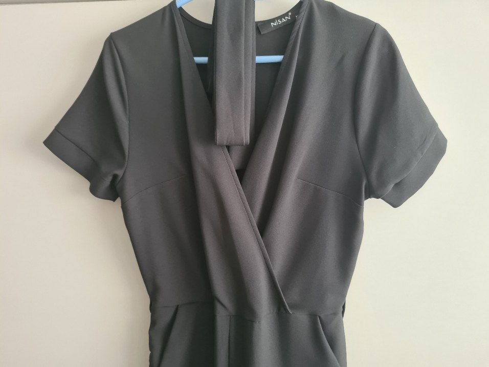 Siyah uzun tulum, V yakalı ve kısa kollu olup, drapeli detay. Düz, yumuşak sentetik kumaştan üretilmiştir, ofis kullanımı için uygundur.