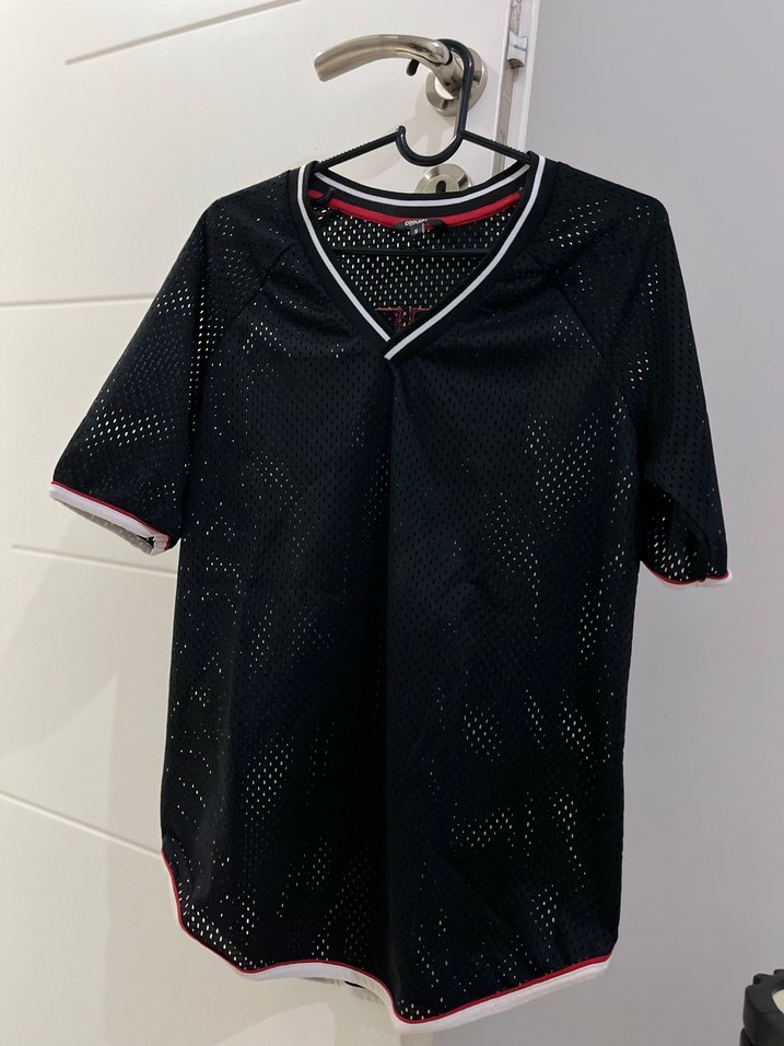Nefes alabilir sentetik kumaştan, dantel detaylı siyah unisex jersey. Kısa kollu, V yakalı, bol kesim ve normal boydadır. Spor ve sokak stiline uygundur.