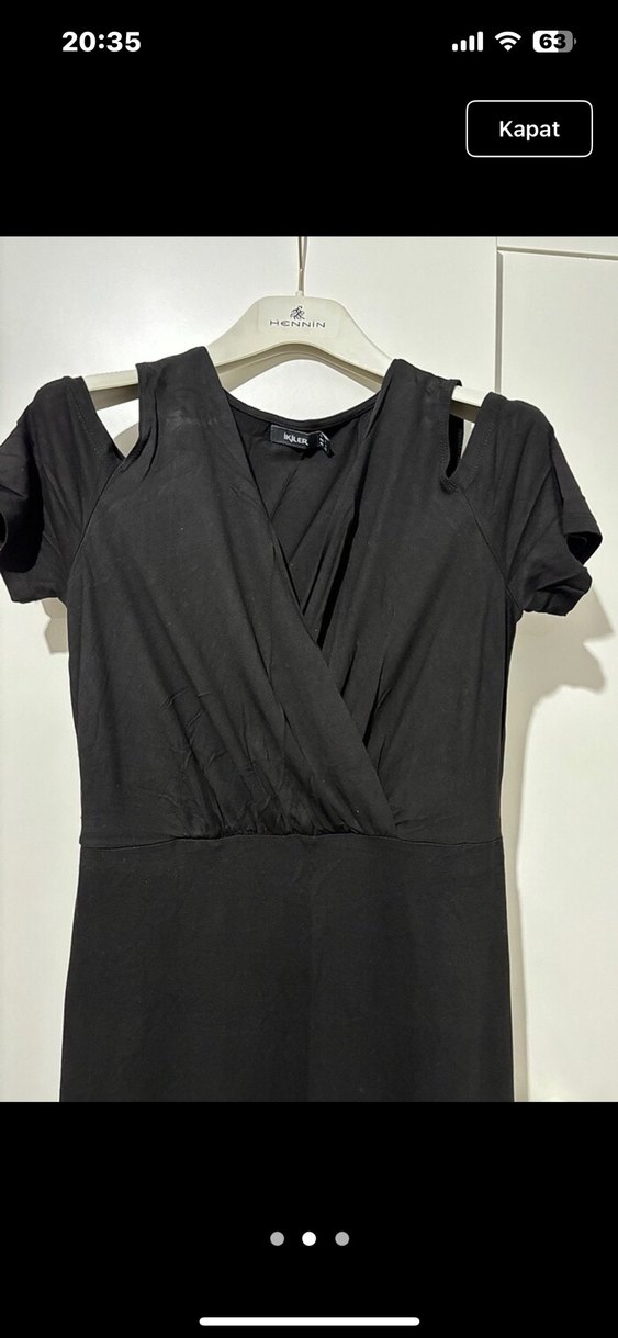 Siyah uzun elbise, V yaka ve kısa kollu, oturan kesime sahip. Drapeli tasarım, yumuşak sentetik kumaştan, günlük kullanıma uygun.
