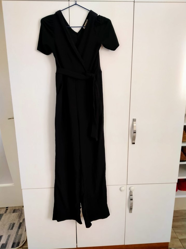 Siyah uzun tulum, V yaka ve kısa kollu drapeli tasarıma sahiptir. Regular fit ve sentetik kumaştan yapılmıştır, ofis için minimalist goth tarzında uygundur.
