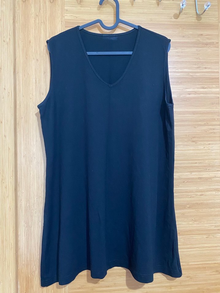 Siyah kolsuz, V yaka basic bluz, normalden uzun boyda ve bol kesimdir. Desensiz, sade tasarımı günlük kullanım için rahat ve şıktır. Tertemiz hiç kullanmadım