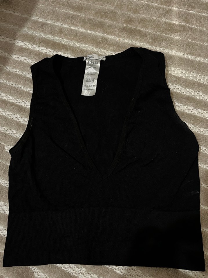 Siyah, kolsuz, V yakalı ve dar kesim crop top. Kısa boylu, düz ve rahat sentetik kumaştan yapılmıştır.