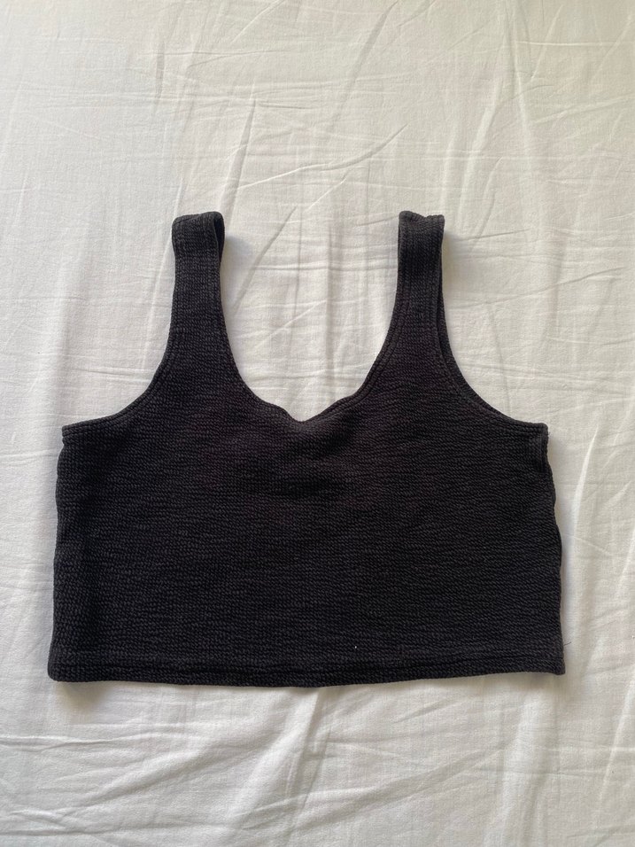 Siyah, kolsuz, keten kumaştan, V yakalı ve vücuda oturan kesime sahip crop top. Günlük sokak stili için uygun, zahmetsiz şıklık sunar.