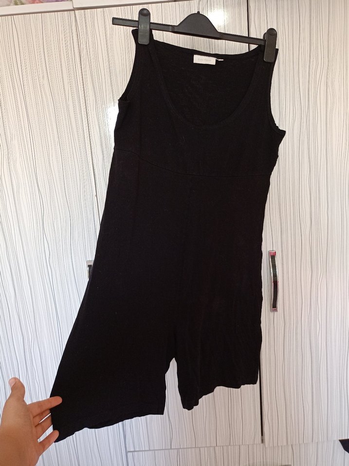Siyah, kolsuz ve V yakalı bu hamile tulumu, günlük kullanım için ipeksi kumaştan yapılmıştır ve şık bir görünüm sunar.