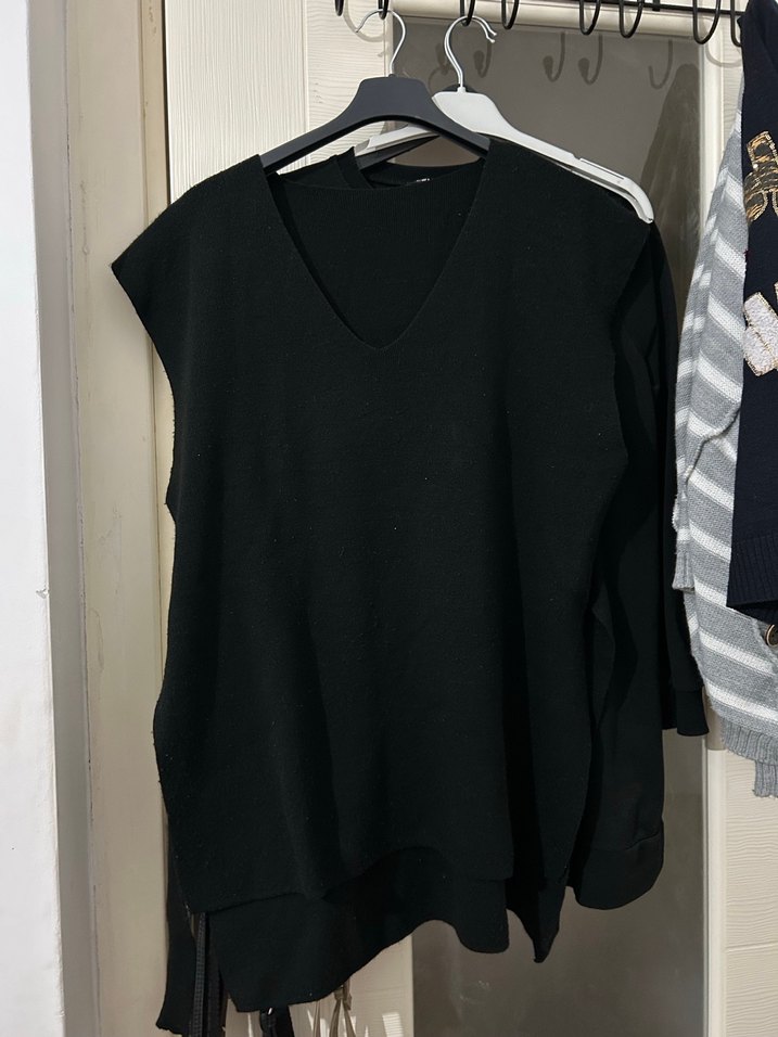 Siyah kolsuz kadın kazak, V yaka ve bol kesimlidir.