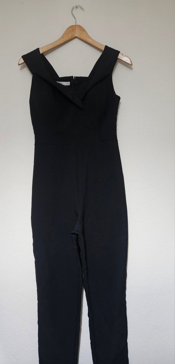 V yaka ve kolsuz tasarıma sahip, siyah, vücuda oturan midi uzunlukta tulum. Düz ve minimalist stil, ofis için şık ve rahat bir seçenek sunar.