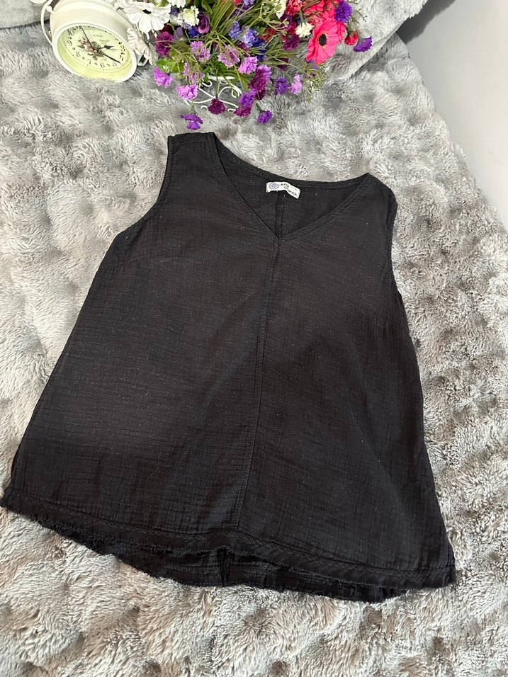 Siyah keten kumaştan, kolsuz ve V yakalı, rahat bol kesim bluz. Düz, desensiz tasarımı günlük kullanıma uygun zahmetsiz şıklık sunar.