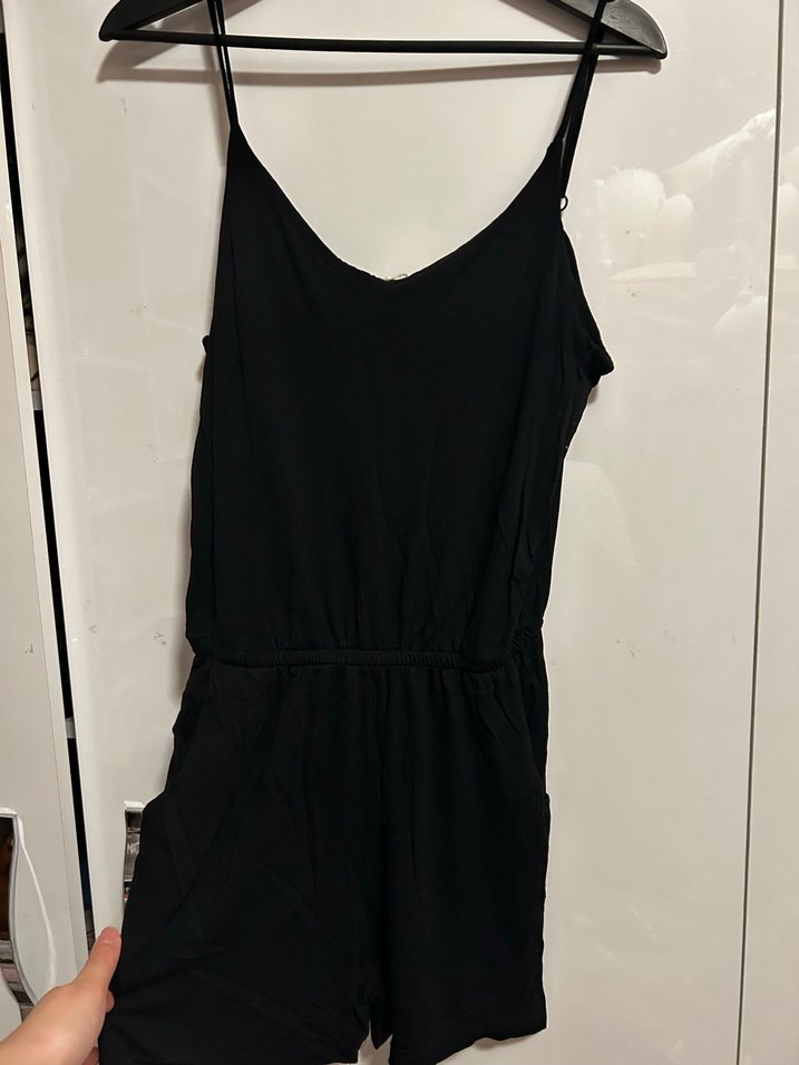 Siyah kolsuz tulum, V yaka ve kısa boyda, ince kumaştan. Günlük kullanıma uygun, rahat ve şık minimalist tarzda. M yazıyor ama bence S daha iyi.