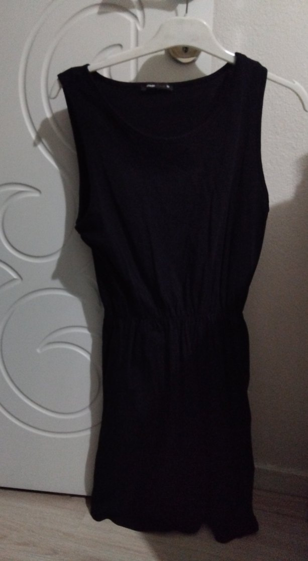Kolsuz ve V yakalı, vücuda oturan siyah midi elbise, yumuşak sentetik kumaştan. Günlük kullanıma uygun minimal ve gotik tarzda.