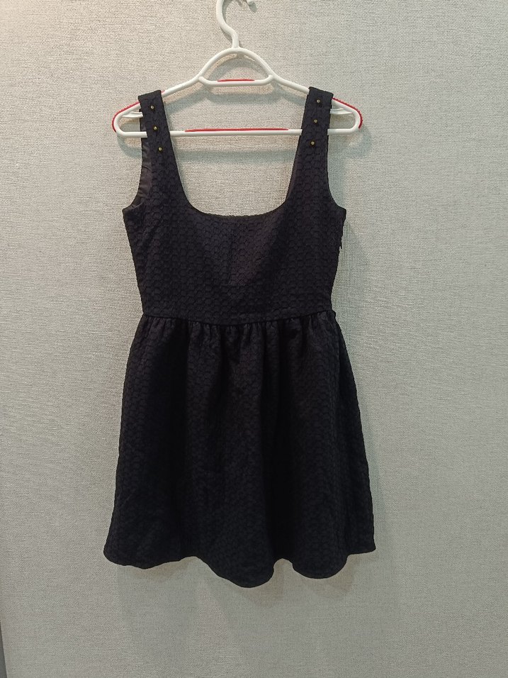 Siyah, kolsuz midi elbise, V yaka ve fırfır detaylıdır. Sentetik kumaştan yapılmış, minimal goth tarzına uygundur.