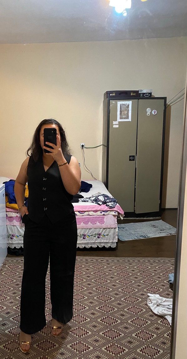 Siyah renkli, kolsuz ve V yaka üst ile midi boy pantolondan oluşan kadın takımı. Sentetik kumaştan yapılmış, desen içermeyen, ofis için uygun şık ve rahat bir modeldir. Hiç giyilmedi denendi katologdan alındı M beden