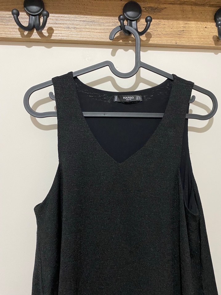 Siyah kolsuz triko elbise, V yaka ve bol kesimlidir. Keten kumaştan, drapeli ve midi boyda olup günlük kullanım için uygundur.