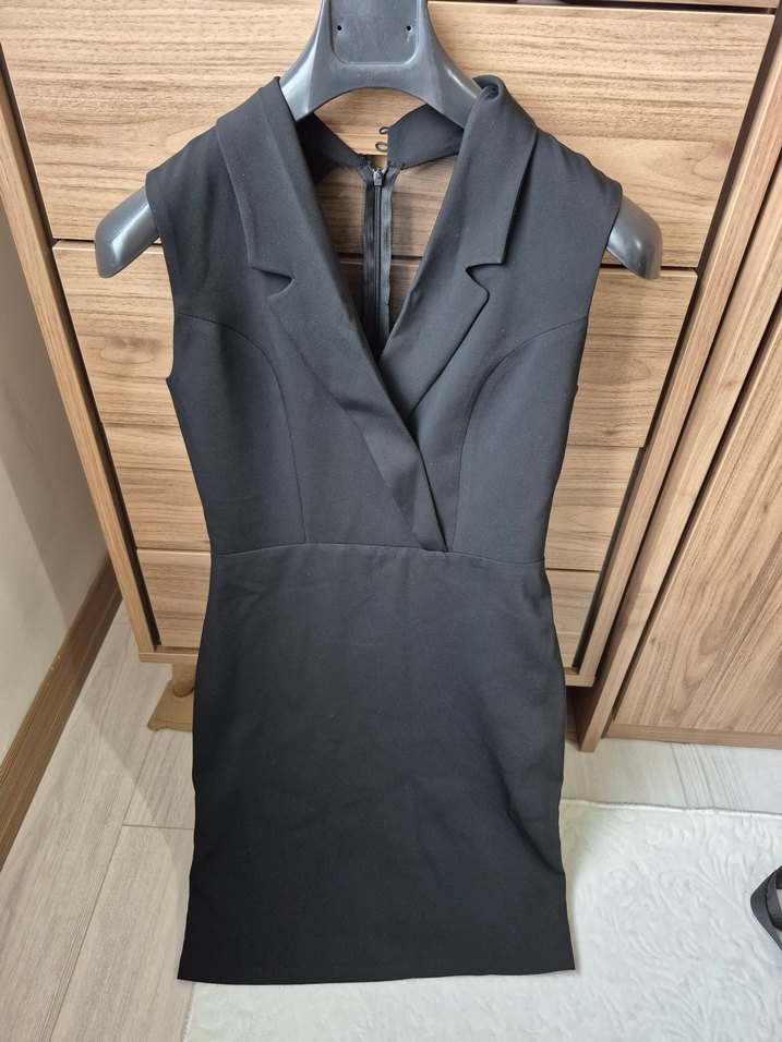 Siyah kolsuz mini elbise, V yaka ve kemerli bel detayıyla düzenli kesime sahiptir. Ofis ve sokak stiline uygundur, desensiz ve kısa boyda.