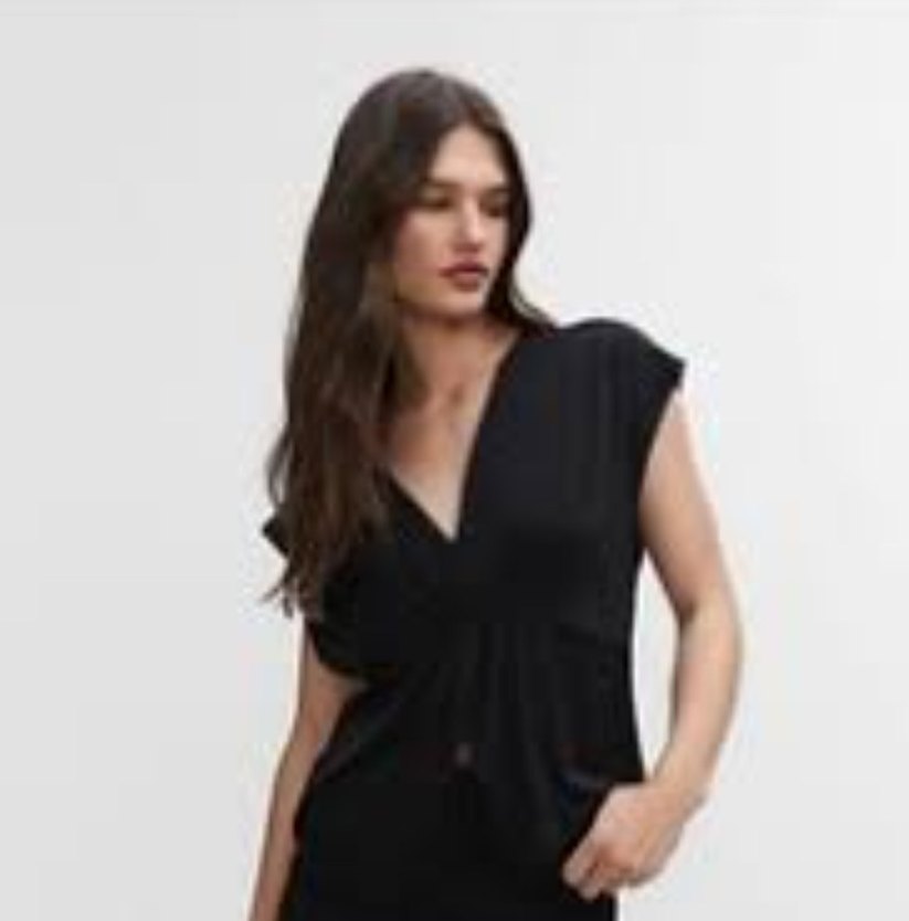 Siyah, V yaka ve kolsuz, rahat kesimli bluz. Yumuşak sentetik kumaştan üretilmiş, gündelik kullanım için zahmetsiz şıklık sunar.