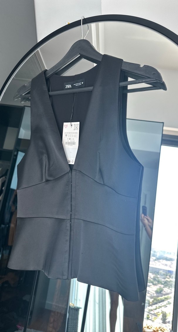 Kopçalı korseve V yakalı, siyah renkli, vücuda oturan kadın yeleği. Midi boyda, saten kumaştan üretilmiş, günlük kullanıma uygun.
