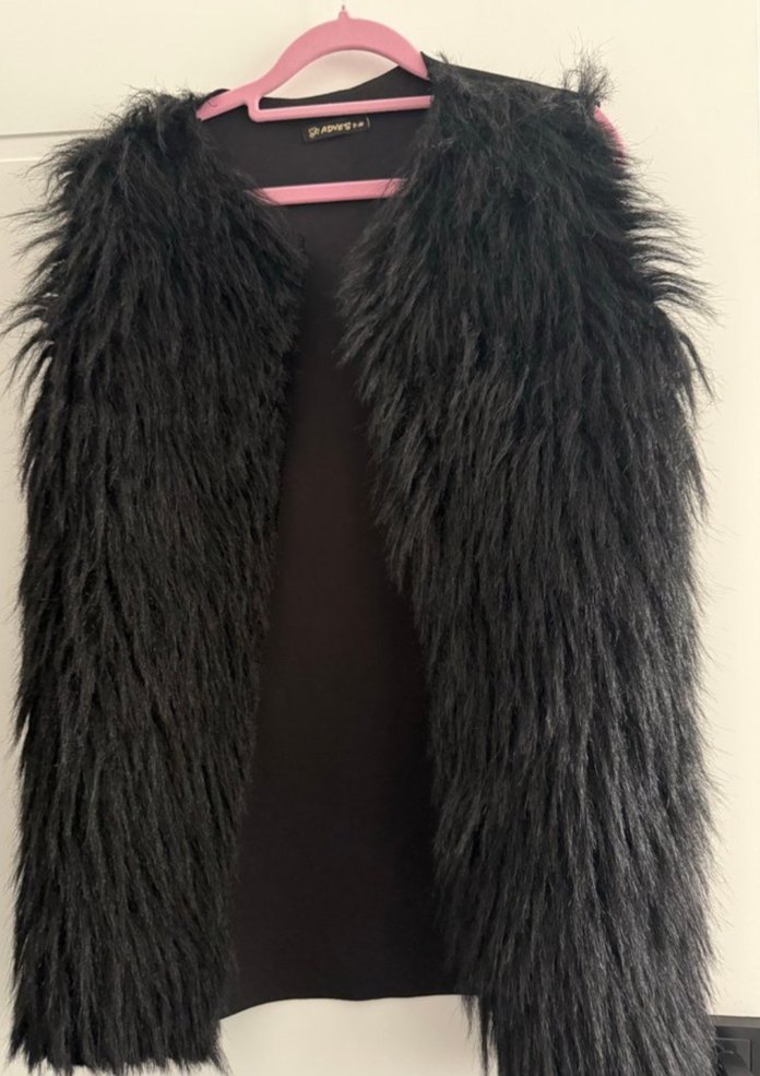 Siyah, kolsuz, kürklü detaylı ve V yaka tasarımlı kadın yelek. Yumuşak sentetik kumaştan, günlük kullanım için uygun, gotik tarzda.
