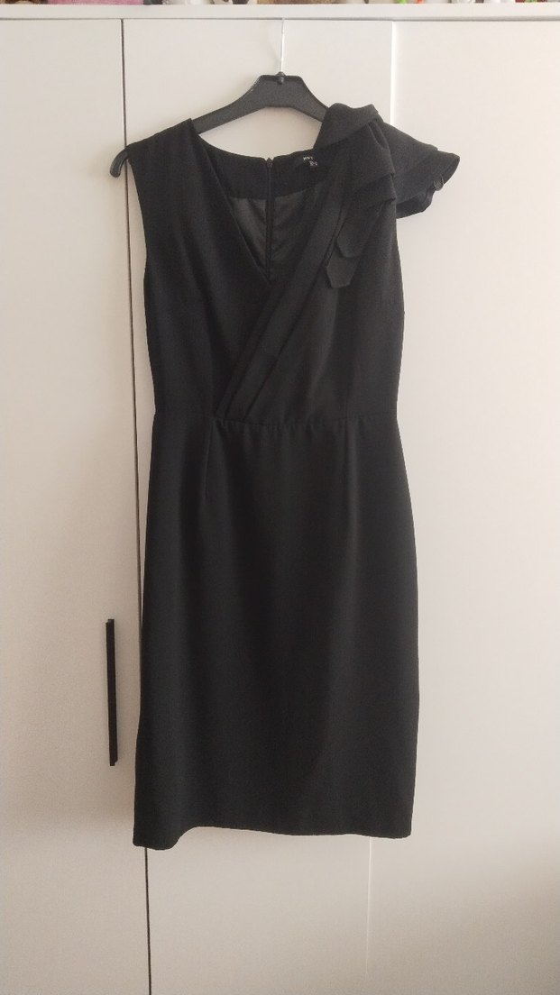 Siyah midi elbise, V yaka ve kolsuz, drapeli detaylara sahip. Ofis için uygun, oturan kesimi ve gotik tarzıyla öne çıkar.