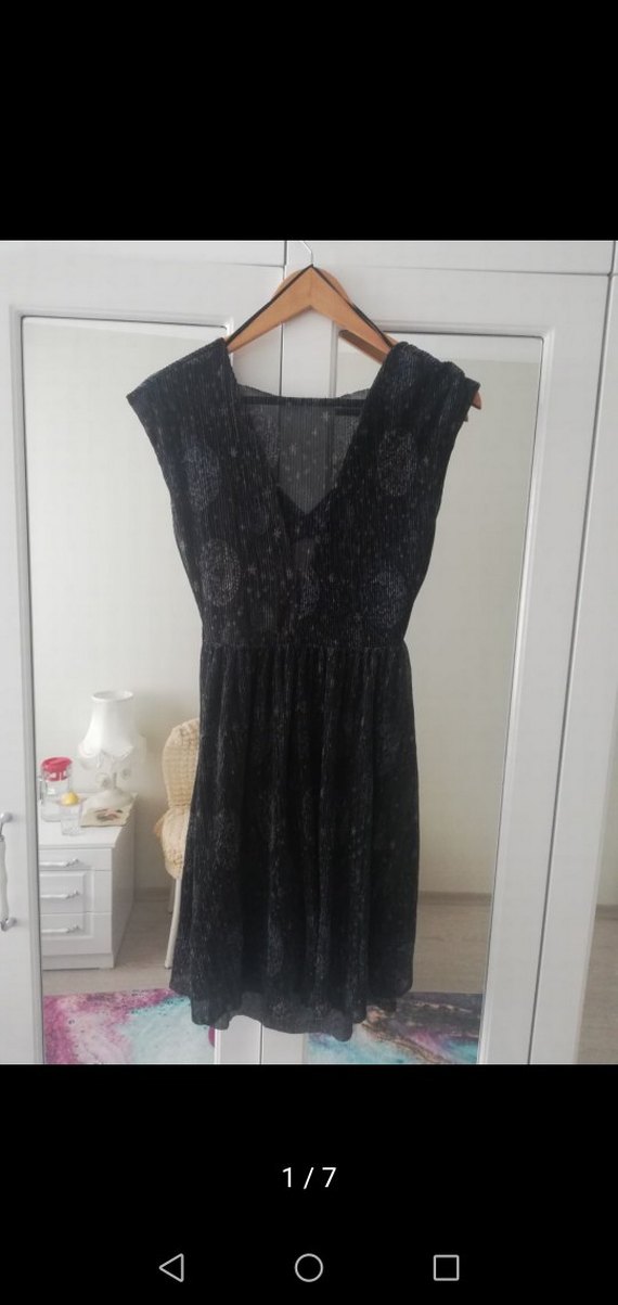Siyah midi elbise, V yakalı ve kolsuz tasarıma sahip. Salaş kesim, drapeli tarz ve batik desen içerir. Romantik akşamlar için uygun. Sırt dekolteli