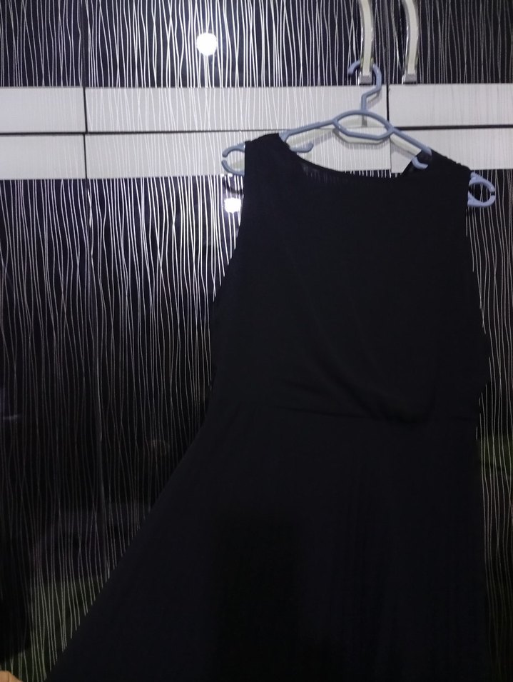 Siyah midi elbise, V yaka ve kolsuz tasarıma sahiptir. Drapeli detaylı, fitted kesimlidir ve minimalist goth tarzındadır.