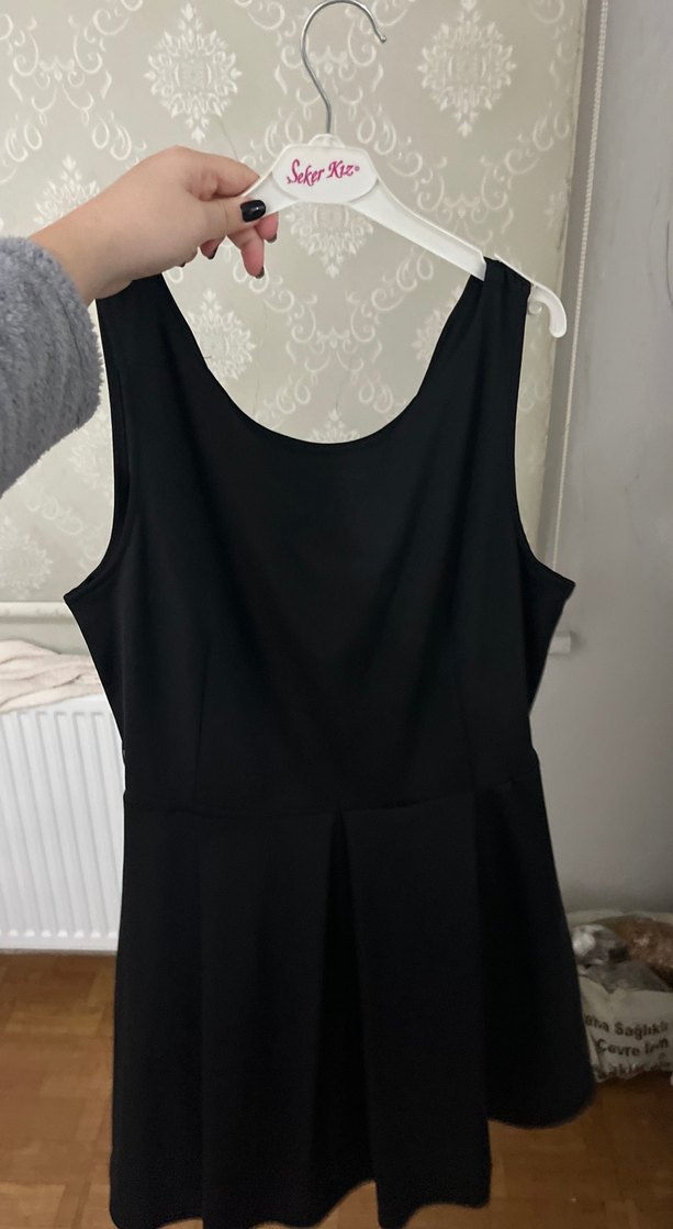 V yaka ve kolsuz tasarıma sahip, yırtmaçlı siyah midi elbise, minimalist ve modaya uygun gotik tarz sunar.