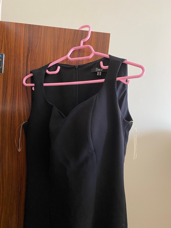 Siyah, v yaka ve kolsuz olan bu dar kesim midi elbise, şık Beden 36 ve 38 beden için uygundur.