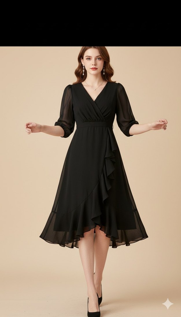 Siyah midi elbise, V yaka ve kısa kollu, bol kesimdir. Fırfır detayları ve ipeksi dokusu ile düğünler için uygundur.
