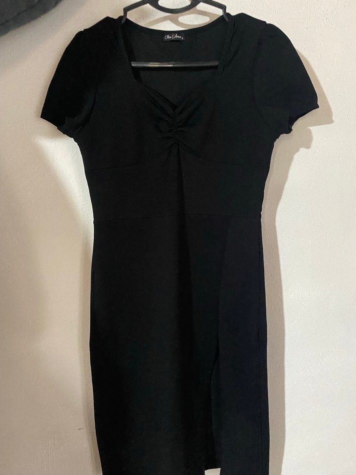 Siyah, V yakalı ve kısa kollu, göğüs kısmında drapeli, ofis stiline uygun, fitted kesim midi elbise. Yırtmac detayı var 2 kere giyildi