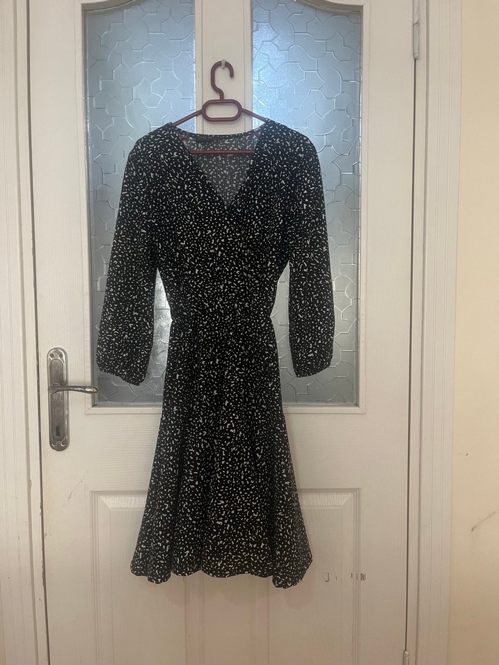 Siyah midi elbise, V yaka ve uzun kollu, bol kesim ve pile detaylıdır. Baskılı minimalist tasarımıyla günlük kullanıma uygundur. Beli ve kolları lastikli