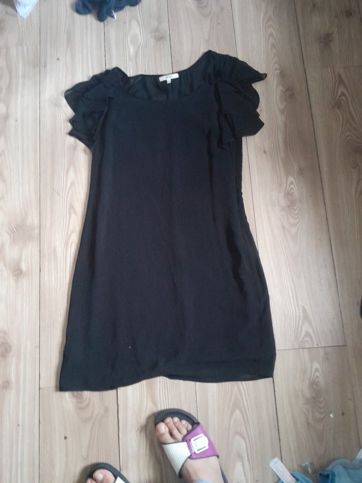 Siyah midi elbise, gevşek kesim, kısa kollu ve fırfırlı detaylarla sade ve gotik tarzda günlük kullanım için uygun.