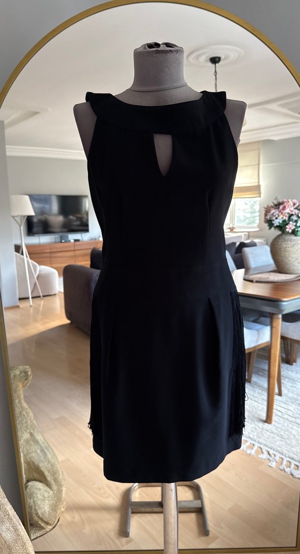 Siyah, V yakalı, kolsuz midi elbise, drapeli detayları ve regular kesimiyle gotik tarzda romantik akşamlar için uygundur.