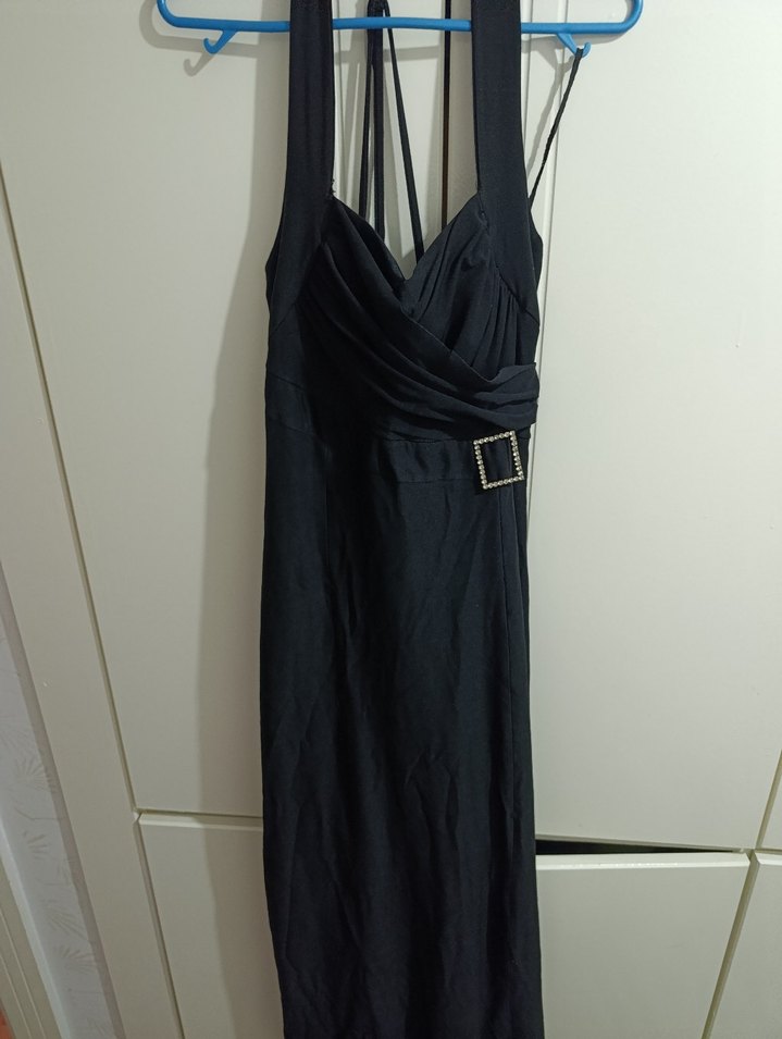 Siyah midi elbise, v yaka ve askılı kollara sahiptir. Belinde dekoratif tokalı kemer bulunur, romantik akşamlar için uygundur.
