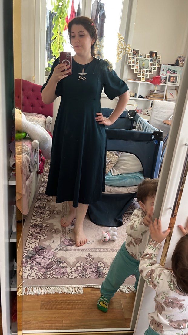 Siyah midi elbise, V yakalı, kısa kollu ve bol kesimdir. Düz sentetik kumaştan yapılmış, günlük kullanım için rahat ve şık bir görünüme sahiptir.