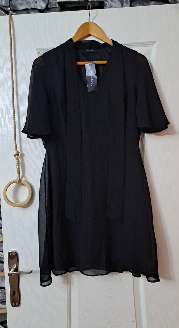 Siyah midi uzunlukta, V yakalı, kısa kollu ve dökümlü tasarıma sahip, loose fit gothic tarzda mezuniyet elbisesi. Ofis için uygun klasik şıklık sunar.