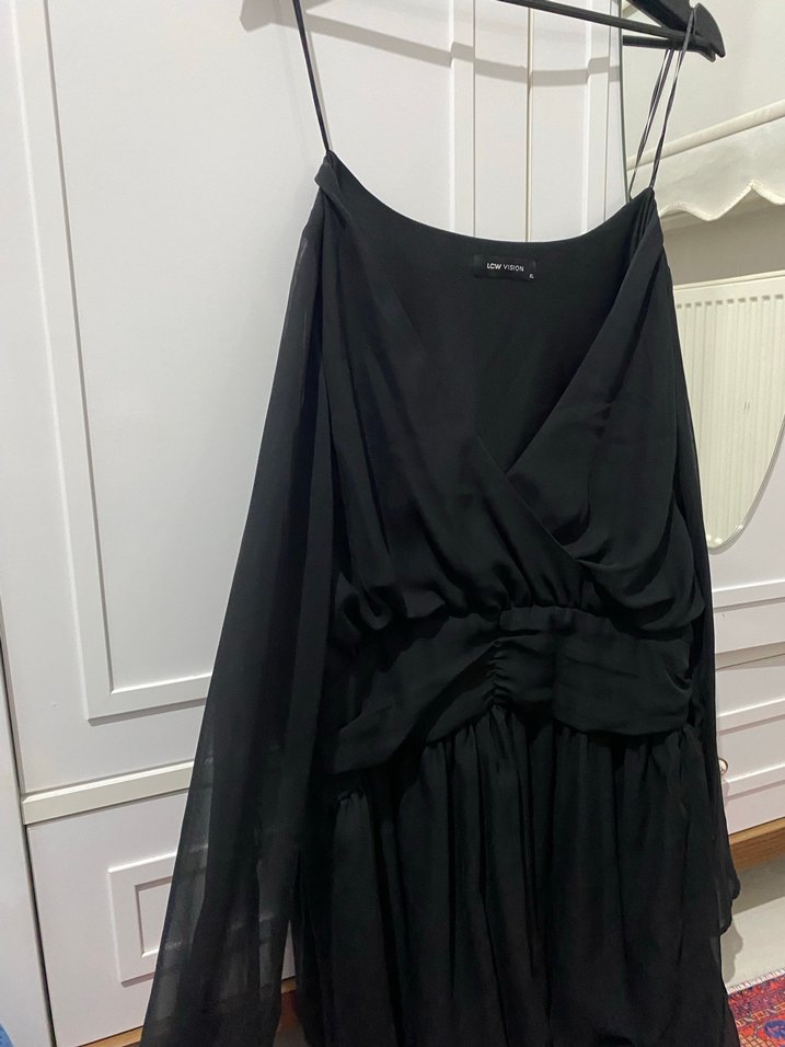 Siyah straplez midi elbise, askılı kollu ve bol dökümlü kesime sahip, gotik tarzda parti elbisesi.