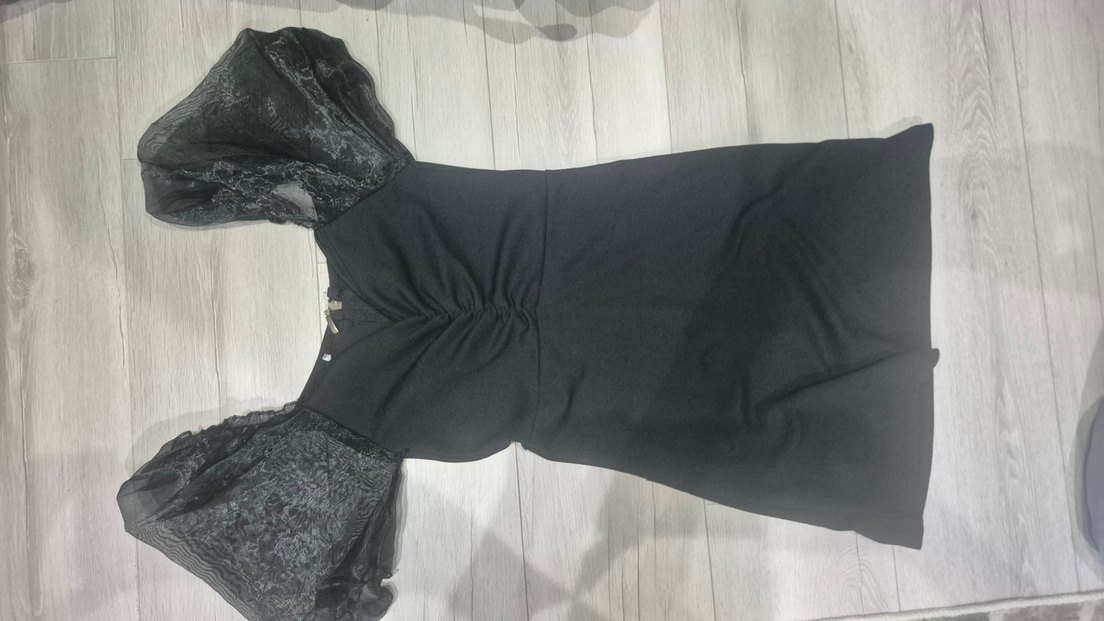 V yakalı, kısa kollu ve drapeli detaylı siyah midi elbise, gotik tarzı yansıtır. Fit kesimi ve desensiz kumaşıyla trend ve avangart bir görünüm sunar.