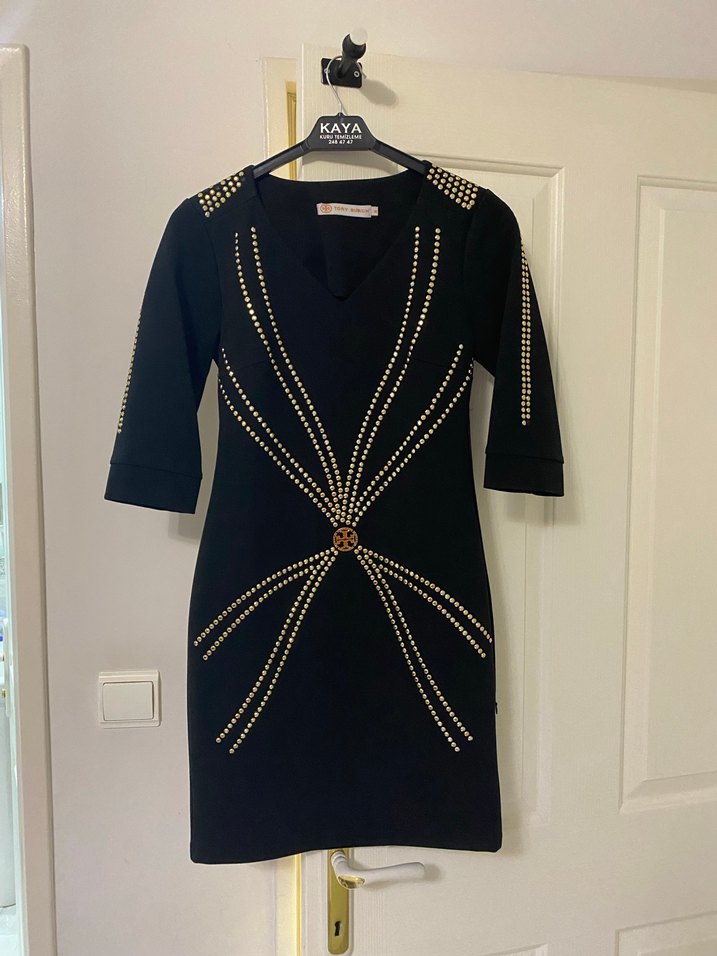 V yaka, üç çeyrek kollu, altın payet detaylarıyla dikkat çeken siyah midi elbise. ✨