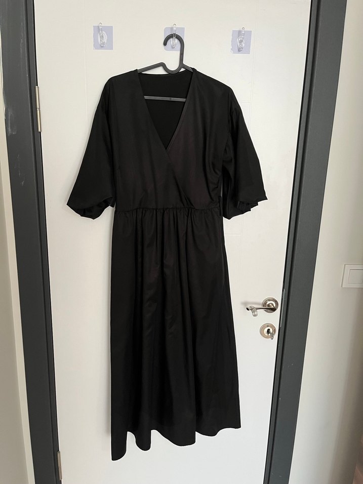 V yakalı, bol kesim ve drapeli ipeksi kumaştan yapılmış uzun siyah elbise. Minimalist gotik tarz için uygundur, askılı kısa kolludur, desensiz ve günlük kullanıma uygundur. Kemeri vardır